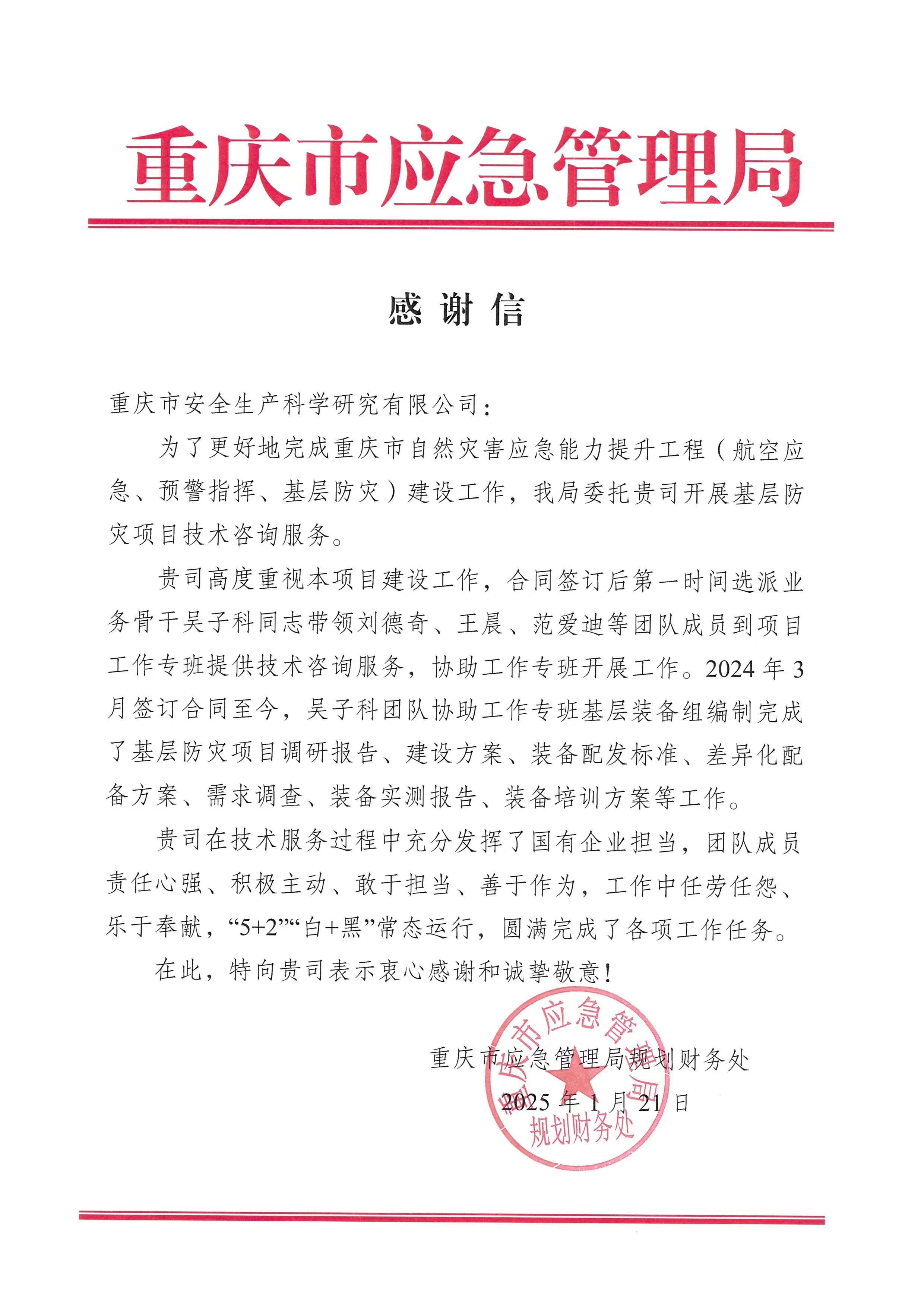 重慶市應(yīng)急管理局就國(guó)債項(xiàng)目技術(shù)支撐服務(wù)工作向公司致